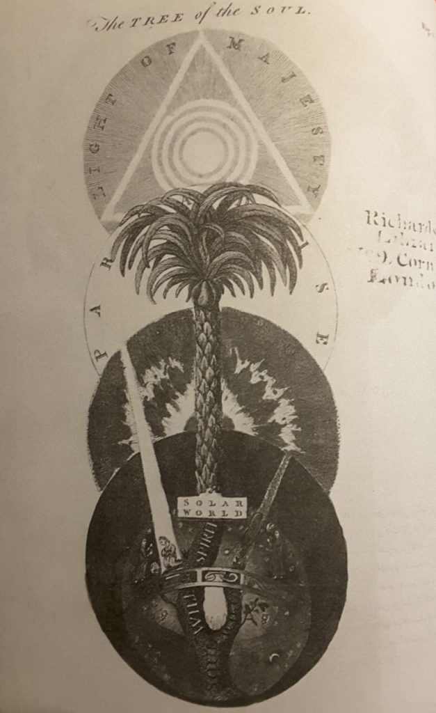 ☆ یک شعاع نور از جهان خودآگاه (دومین دایره) به درون جهان تاریک ناخودآگاه (چهارمین دایره) که درخت رشد معنوی و روانی انسان در آن ریشه دارد، نفوذ می کند. این درخت که به شکل نخل ترسیم شده، با عبور از جهان آتشین عذاب و تجربه، در فضای نورانیِ آگاهی برتر که رو سوی نور خدا دارد، گسترش می یابد. در این تصویر، عبور از آتشِ تجربه و عمل، قطعی است زیرا درخت معرفت، میوه اش را به عالَمی تقدیم می کند که نور را از همانجا دریافت کرده است. اگر به دایره ی پایینی خوب دقت کنی، یک تنه ی فرعی دیگر می بینی که از تنه اصلی جدا شده و به سمت دایره آتش رفته و عاقبتش نیز به همانجا ختم می شود، این همان مسیر نفسانی است. اما تنه ی اصلی، که همان راه حقیقی است قدرتمندانه از دایره آتش عبور می کند و خود را به منبع نور می رساند.