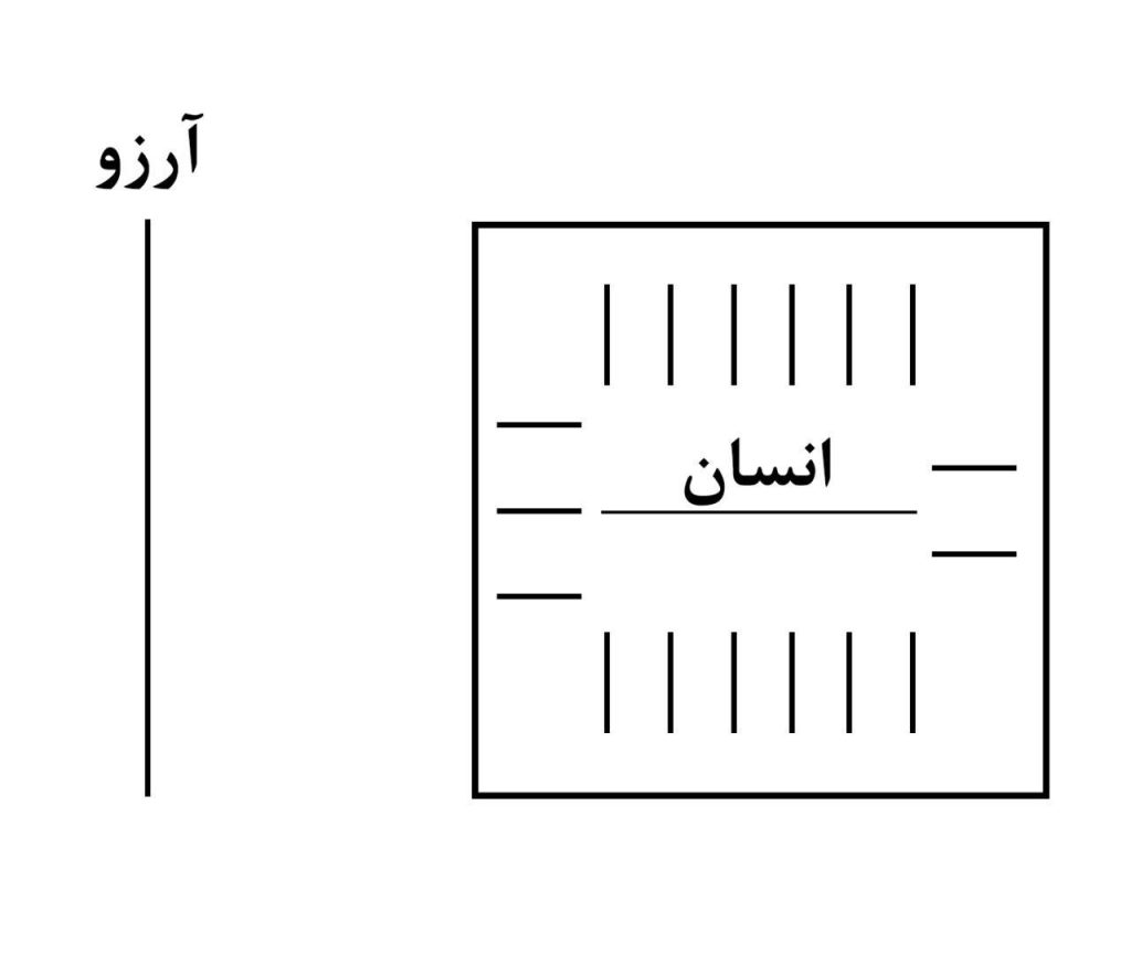 نوامبر 28, 2018☆ این خط میانی، انسان است. خطوطی که در اطراف هستند، بلایا و حوادث اند، و این بلایا و حوادث، از هر سو انسان را می گزند. اگر این یکی به هدف نخورد، آن یکی می خورد. مربّع، اَجَل است که او را در میان گرفته است، و خطّ بیرون از مربّع، آرزوست!